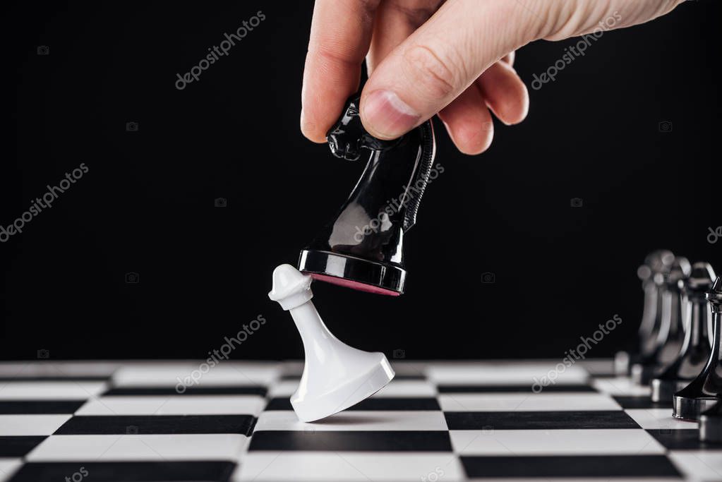 частичный вид человека, делающего ход с рыцарем на шахматной доске изолированы на черном