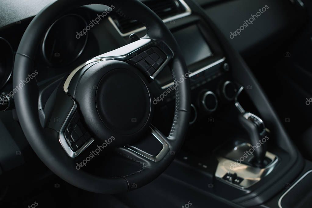 - селективный фокус руля возле ручки переключения передач в роскошном автомобиле