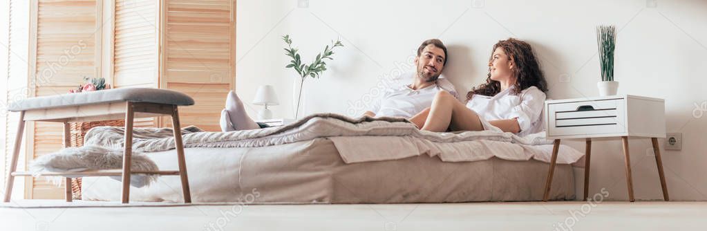 Панорамный снимок счастливой пары лежащей на кровати в спальне