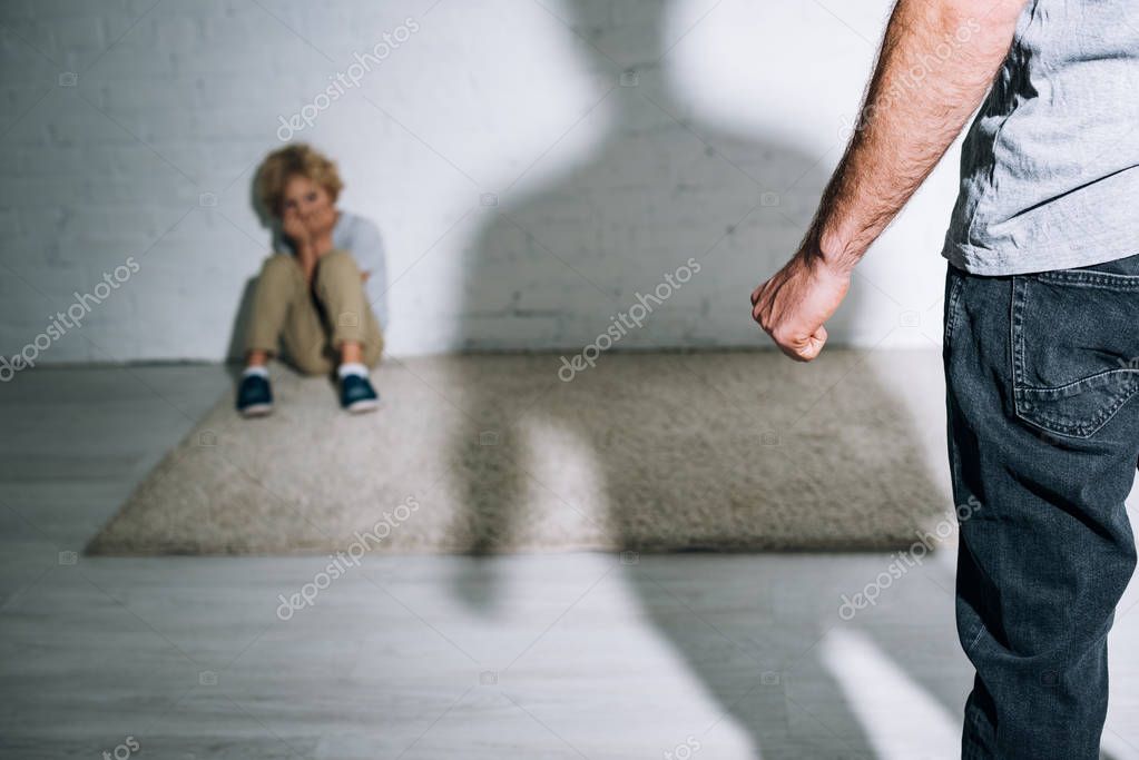 частичный взгляд на жестокого отца и испуганного сына, сидящего на ковре