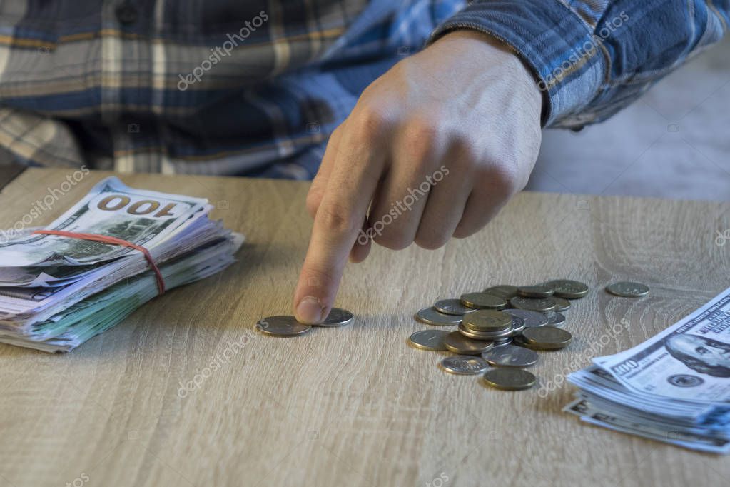 - Мужчина считает деньги в руке. Экономия, сбережения, зарплата и пожертвования .