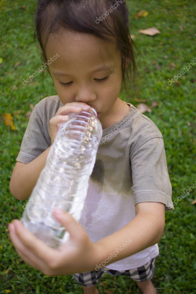 маленькие дети пьют воду из бутылки в зеленом парке .
