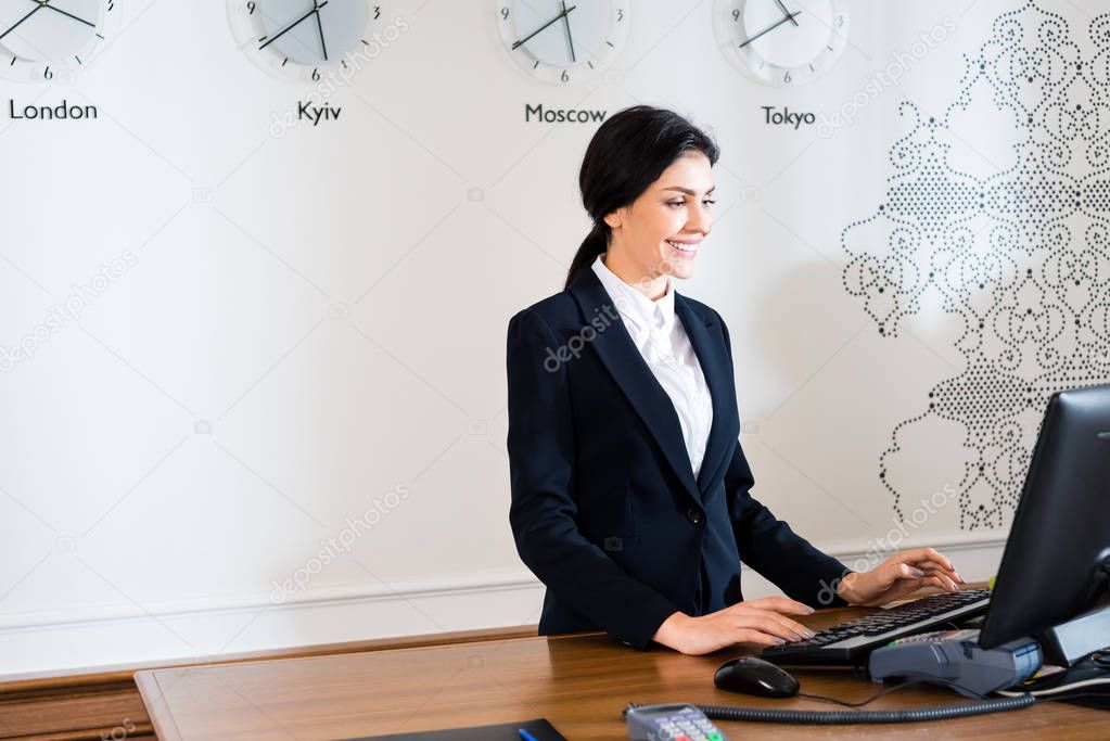 счастливая брюнетка секретарша в формальной одежде стоит рядом с монитором компьютера в отеле