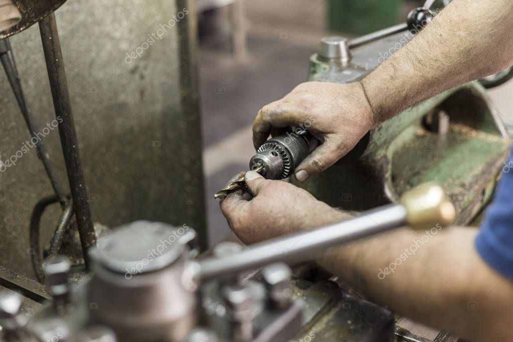 Человек в металлургическом цехе использует токарный станок для обработки металлических объектов для производства газовых котлов