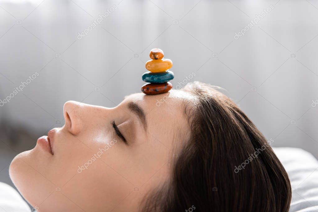 женщина лежит с закрытыми глазами с красочными камнями на лбу