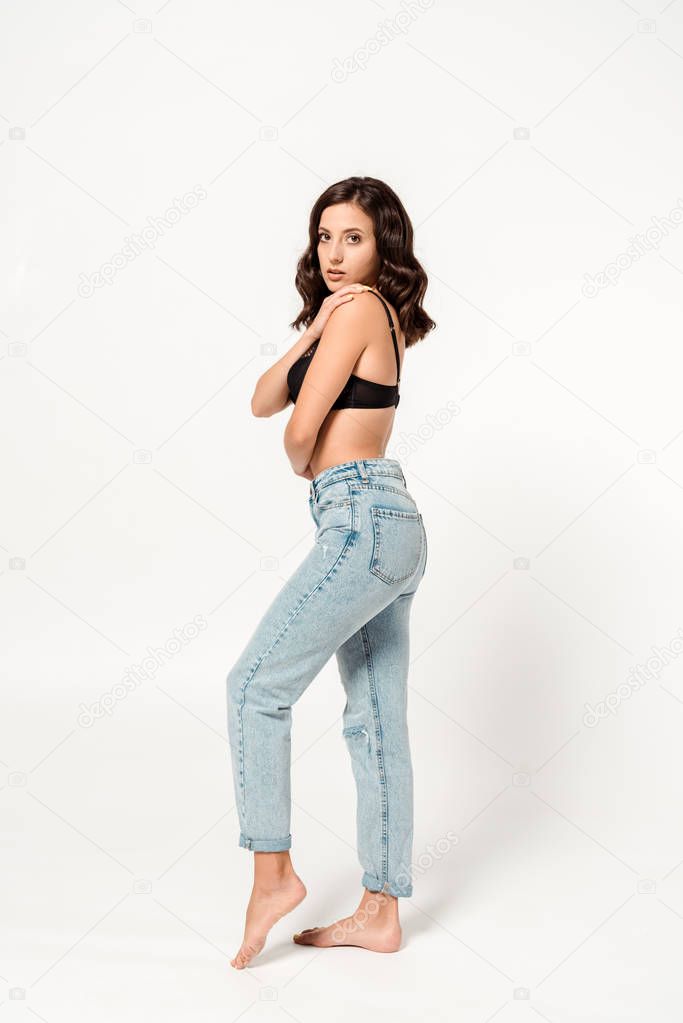 - привлекательная молодая женщина в кружевном лифчике стоит в синих джинсах на белом