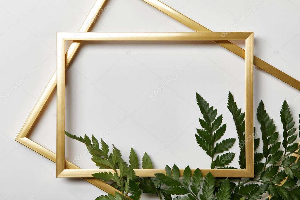вид сверху пустых золотых рам на белом фоне с копировальным пространством и листьями папоротника