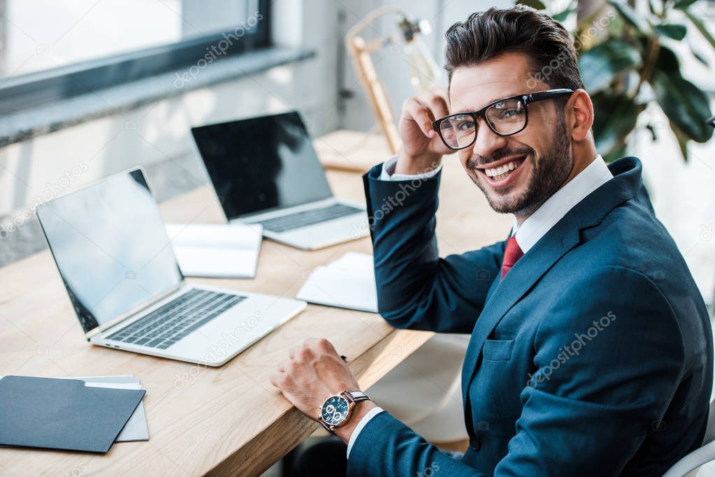 Избирательный фокус веселого человека в очках, смотрящего на камеру рядом с ноутбуками с пустыми экранами
