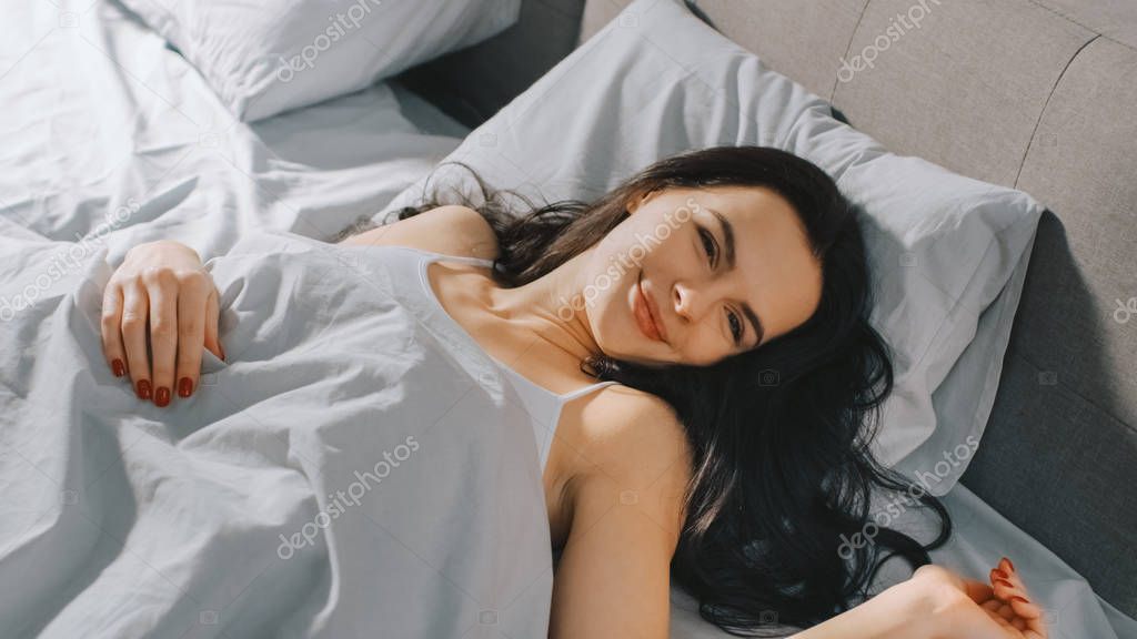 - Красивая брюнетка медленно просыпается утром, лежа в постели, очаровательно улыбается. Солнце светит счастливой молодой девушке из большого окна .