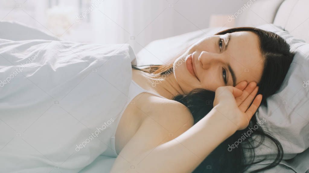 Красивая брюнетка медленно просыпается утром, лежа в постели, очаровательно улыбается. Солнце светит счастливой молодой девушке из большого окна