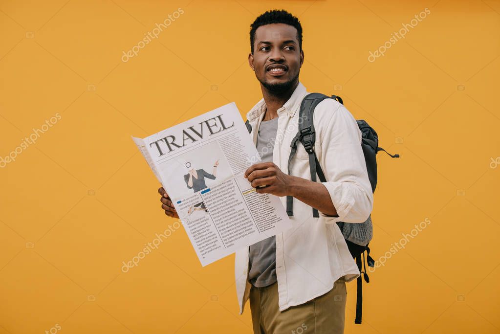 - Веселый африканский американец, стоящий с рюкзаком и держащий в руках газету, изолированную от апельсина