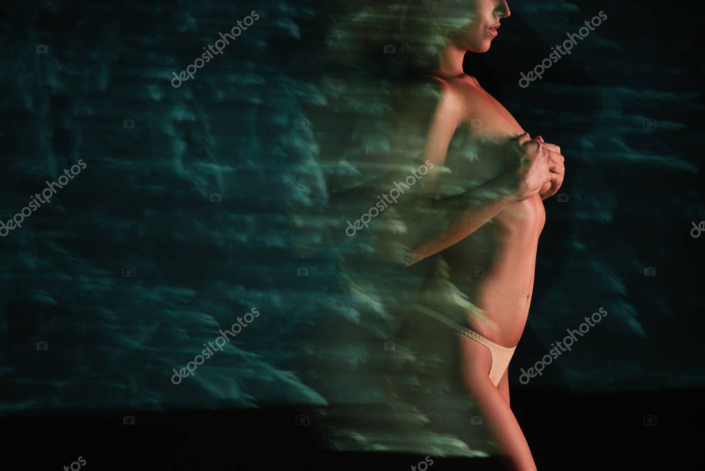 движение размытие девушки стоя и покрывая грудь рядом сосны на черном