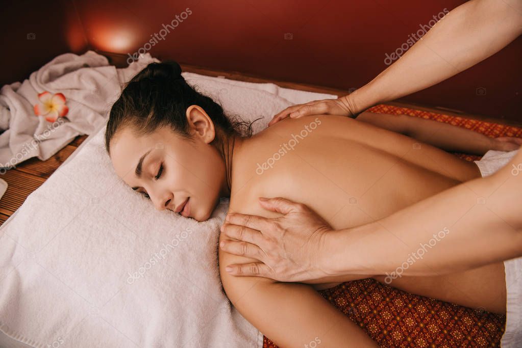 Обрезанный вид массажера, делающего массаж спины женщине на коврике для массажа