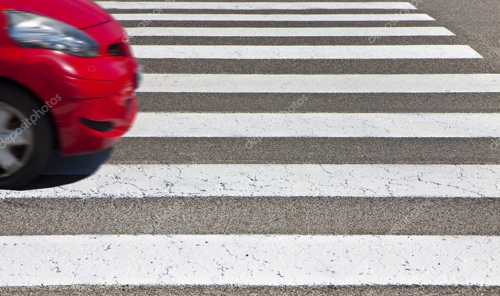 Black and white pedestrian crossing with red car on background - image with copy space - The car 's shape has been modified and is not recognizable