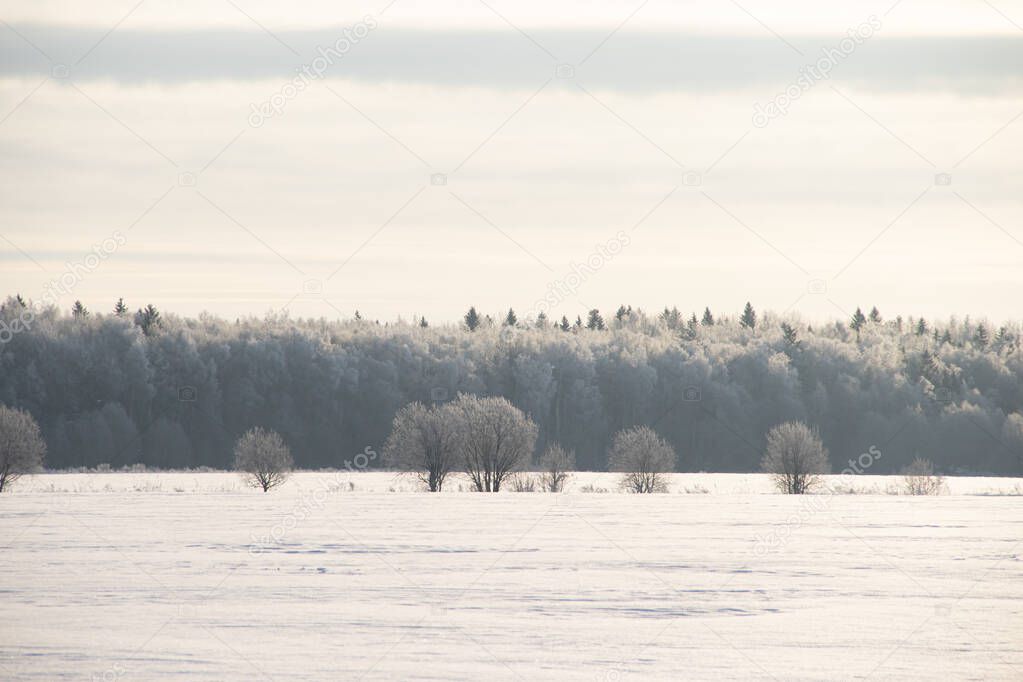 - Снежный зимний пейзаж в поле. Замерзшие белые деревья. Открытые пространства России .