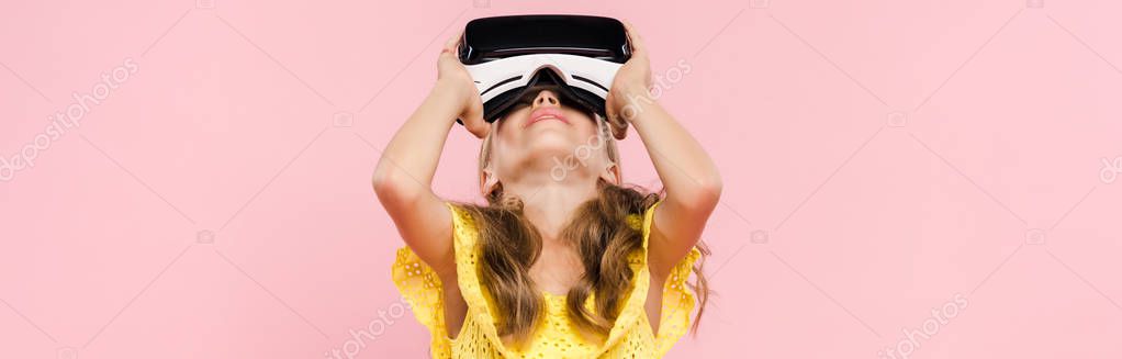 панорамный снимок ребенка с гарнитурой виртуальной реальности, смотрящего на розовый