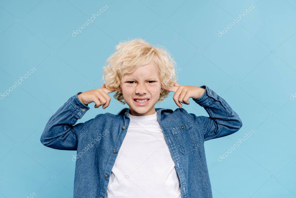 раздраженный и милый ребенок, смотрящий в камеру и касающийся ушей, изолированных на голубом