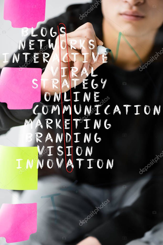 Обрезанный взгляд SEO менеджера, пишущего на стекле с иллюстрацией концептуальных слов социальных медиа
