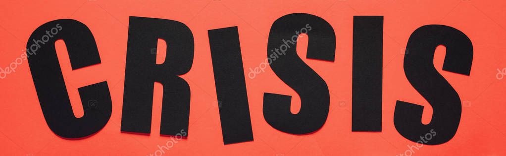 Верхний вид черного слова кризис на красном фоне, панорамный снимок