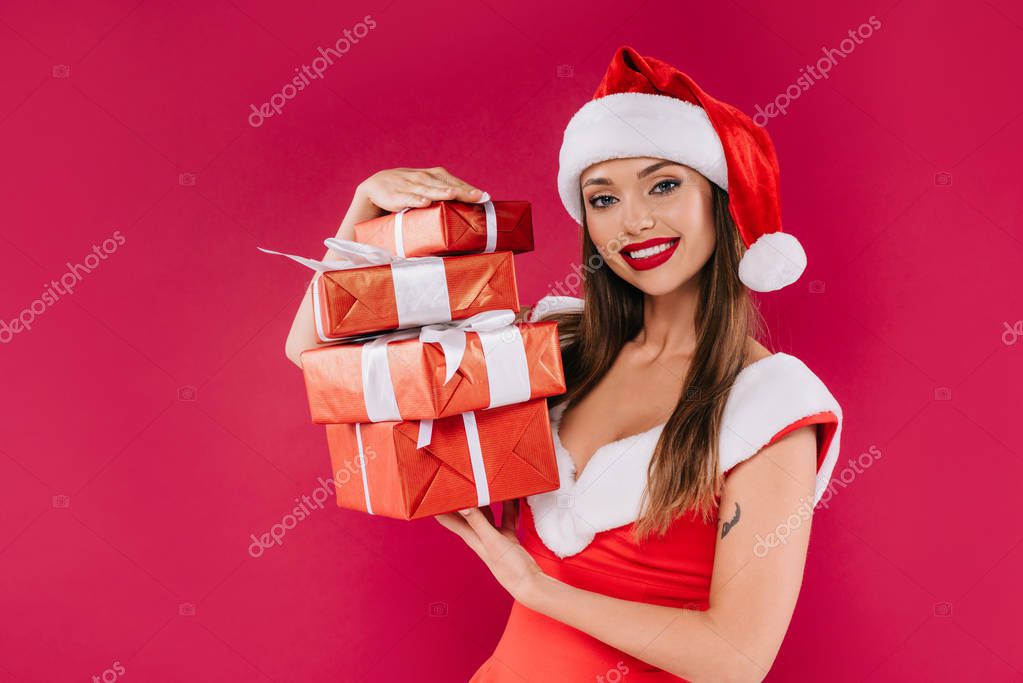 улыбается сексуальная красивая Санта девушка держит подарочные коробки изолированы на бордовый