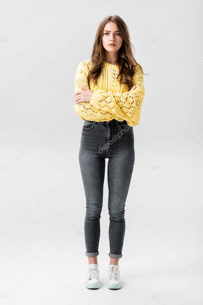 расстроенная девушка, стоящая со скрещенными руками и смотрящая на камеру, изолированную на сером