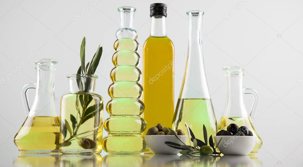 - Оливковое масло бутылки, оливковая ветвь и кулинарные масла