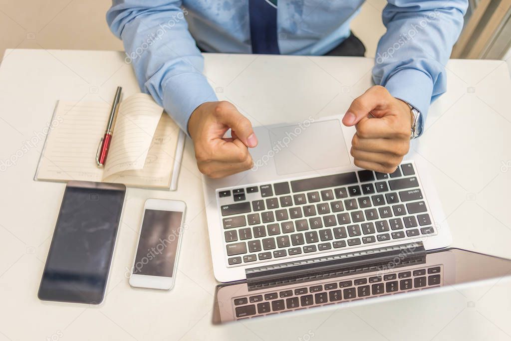 - Взгляд сверху на бизнесмена получает хорошие новости