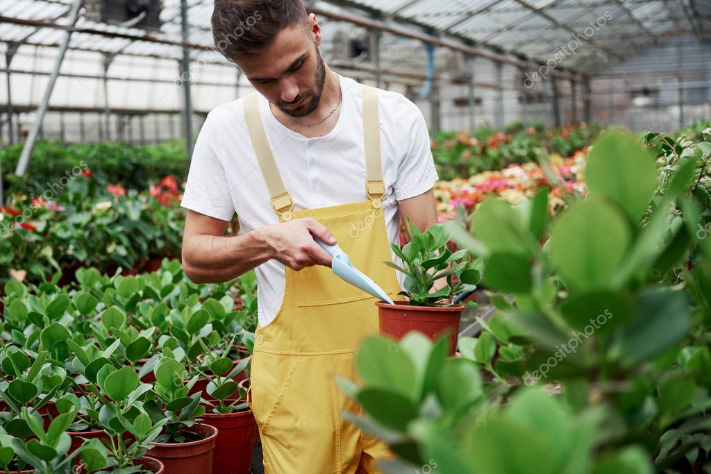 Много цветов. Человек садовник в желтой и белой одежде работает с зелеными растениями в вазах .