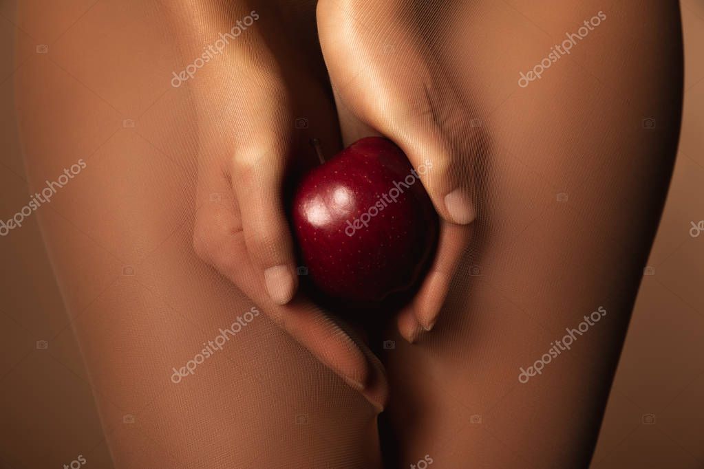 - обрезанный вид женщины в нейлоновых колготках держа спелое красное яблоко изолированы на коричневый