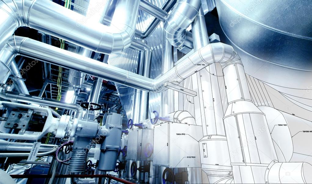 Эскиз оборудования, кабелей и трубопроводов, найденных внутри современного промышленного плана энергетики