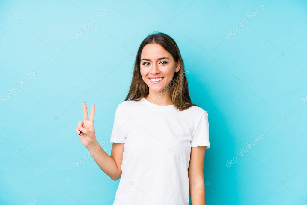 - Молодая белая женщина в изоляции показывает номер два с пальцами.