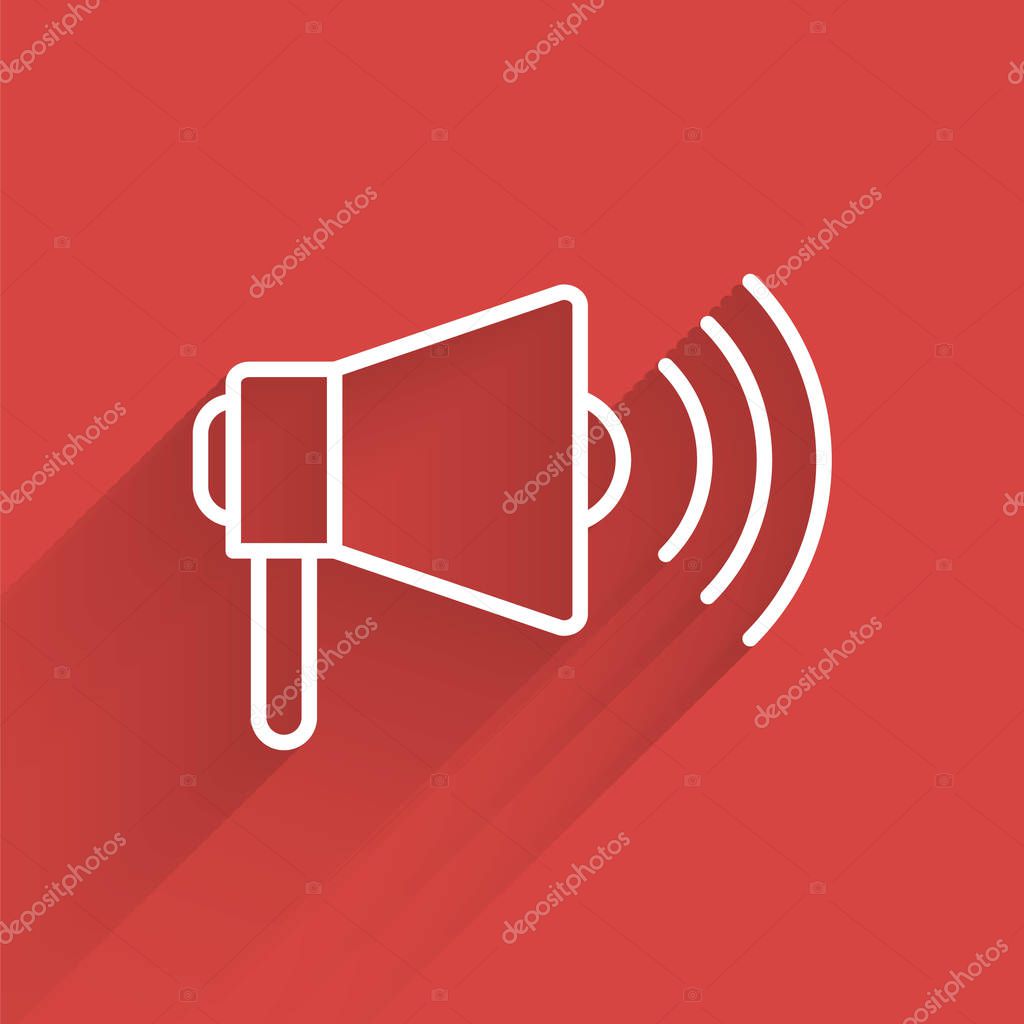 - Иконка мегафона белой линии изолирована с длинной тенью. Концепция громкого оповещения. Буллхорн для промоушена. Векторная миграция