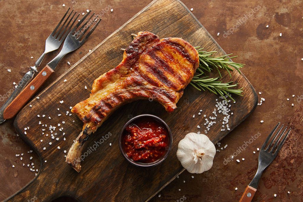 - Вид сверху на стейк из рибея с томатным соусом и чесноком на разделочной доске вилками на каменном фоне