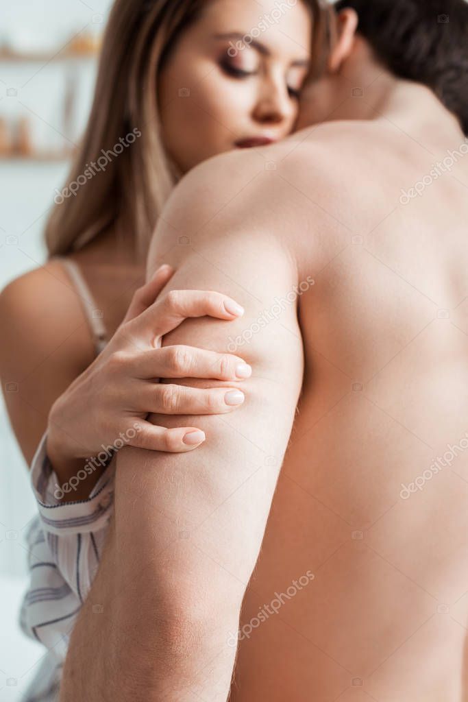 - избирательный фокус страстной женщины, царапающей мужчину без рубашки