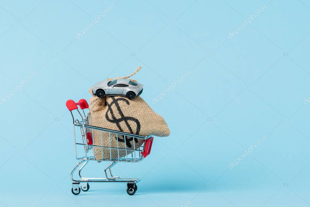 - маленький торговый тележка с долларовой сумкой и игрушечный автомобиль на синий, лизинговая концепция