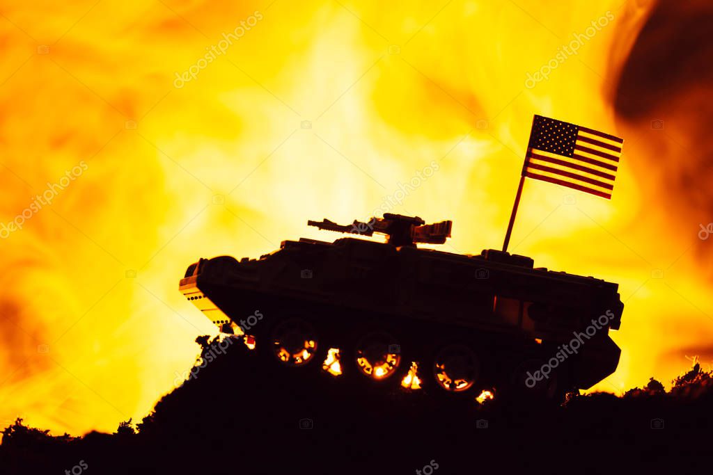 - Сцена боя с американским флагом на игрушечном танке и огонь на заднем плане