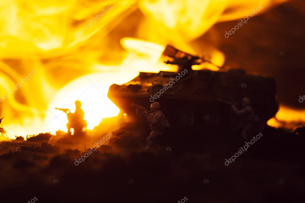 - Солдаты-игрушки с танком, огнем и закатом на черном фоне, сцена боя