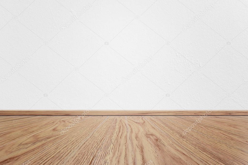 - Пустой интерьер комнаты с белой текстурой цементной стены и коричневым деревянным узором пола. Концепция интерьера винтажного стиля