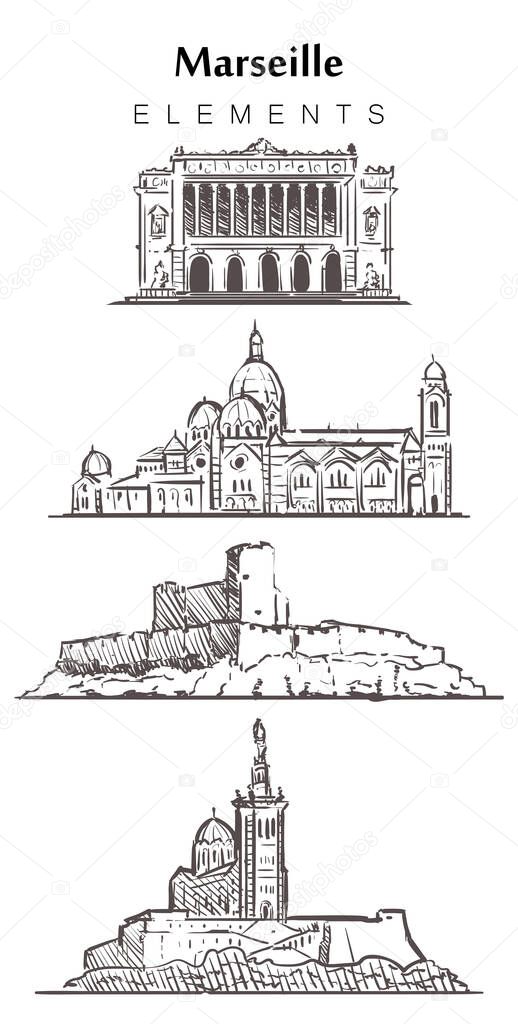 Набор элементов ручной работы зданий Марселя набросок векторной иллюстрации. Chateau, Bourse Marseille, Fellica, Cathay