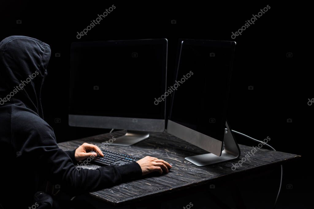 - хакер с помощью компьютерной мыши и глядя на мониторы компьютера с пустым экраном изолированы на черном