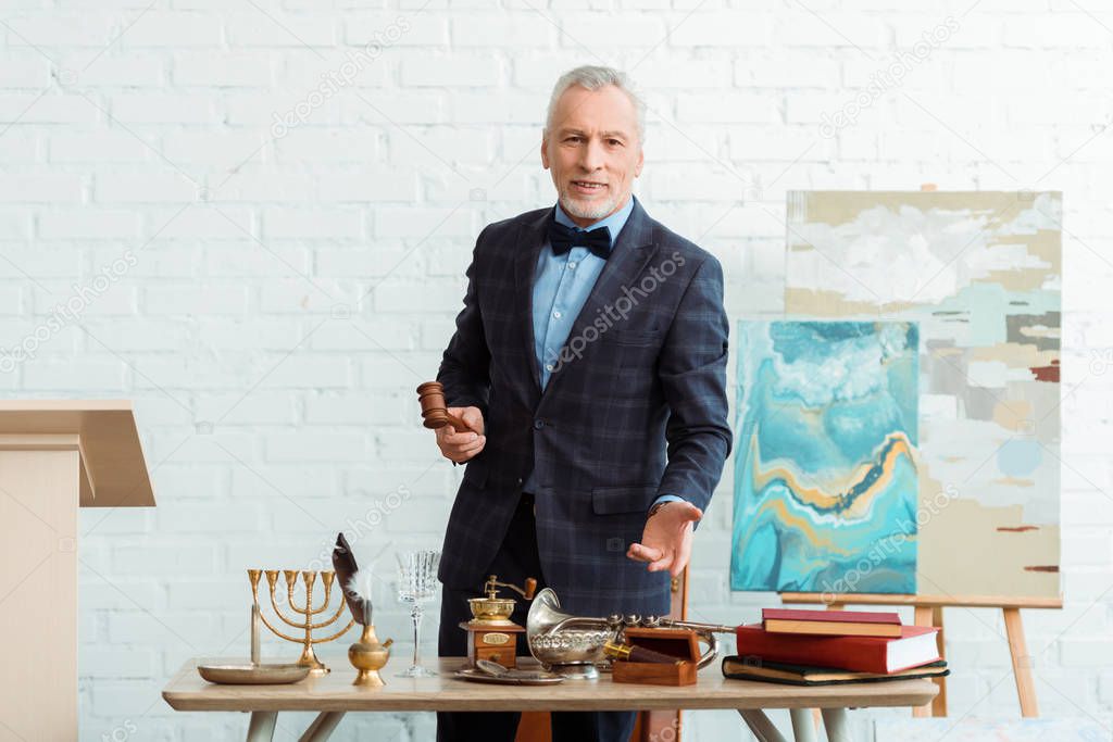 улыбающийся аукционист, держащий молоток и указывающий рукой на антикварные предметы во время аукциона