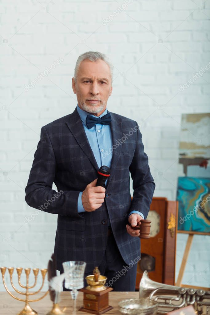красивый аукционист в костюме держит микрофон и молоток во время аукциона