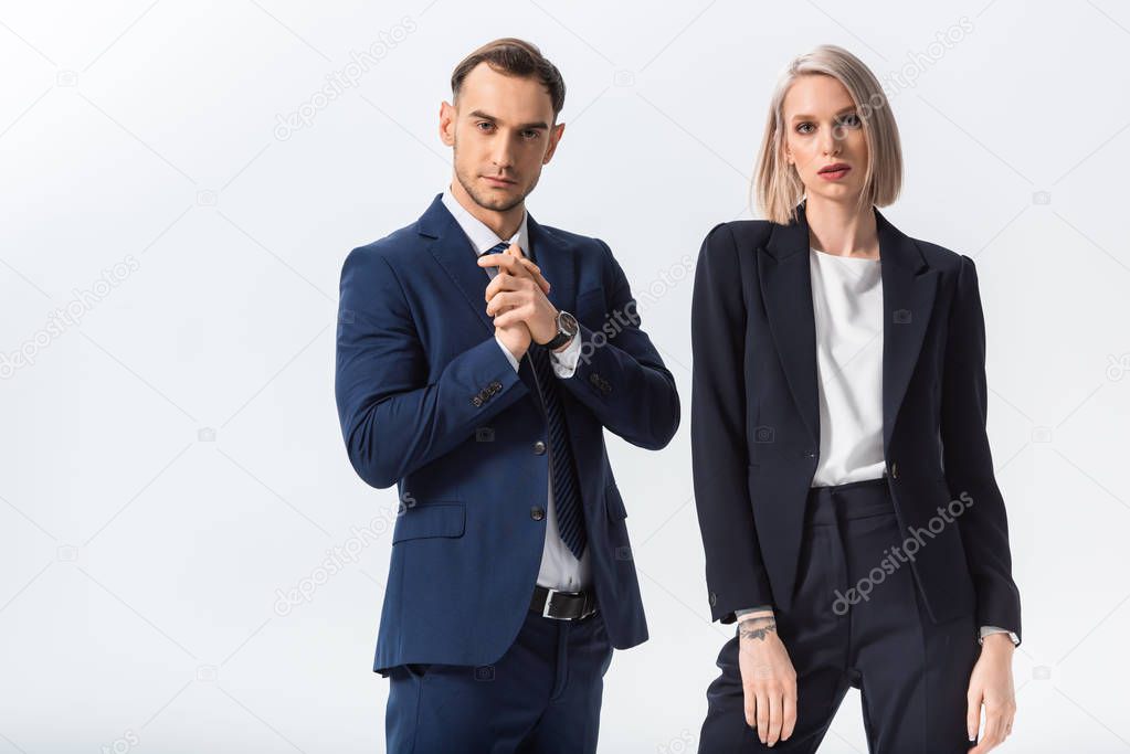 успешный молодой татуированный бизнесмен и бизнесвумен, изолированные на белом