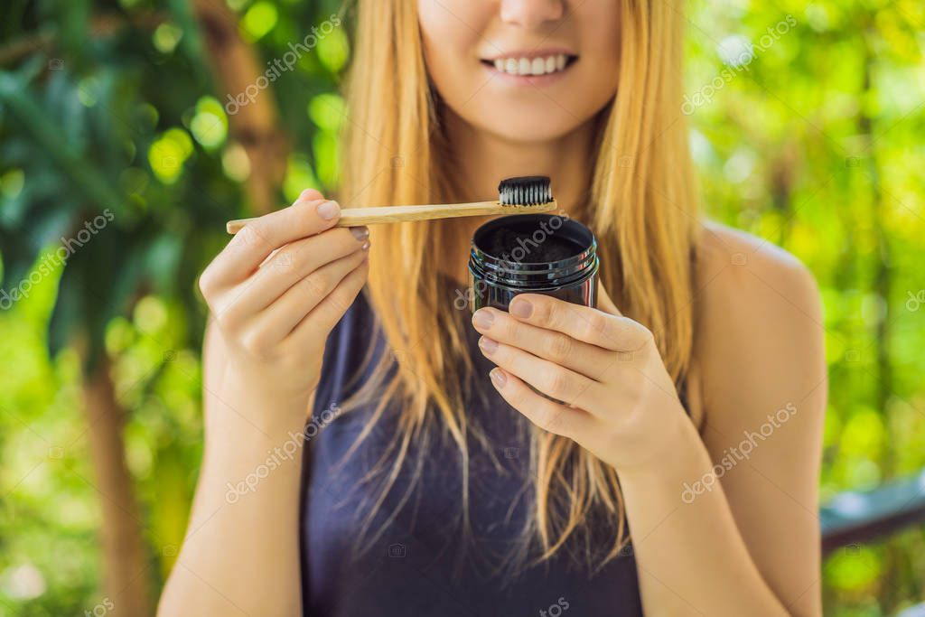 - Молодая женщина чистит зубы с помощью активированного угольного порошка для чистки и отбеливания зубов. Эко-кисть бамбука