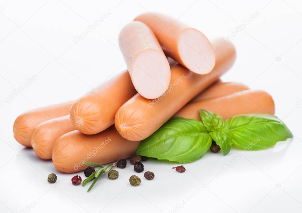 Классические колбасы из свинины с перцем и базиликом на белом .