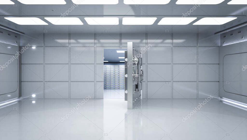 3D рендеринг внутреннего банковского хранилища с разблокировкой дверей