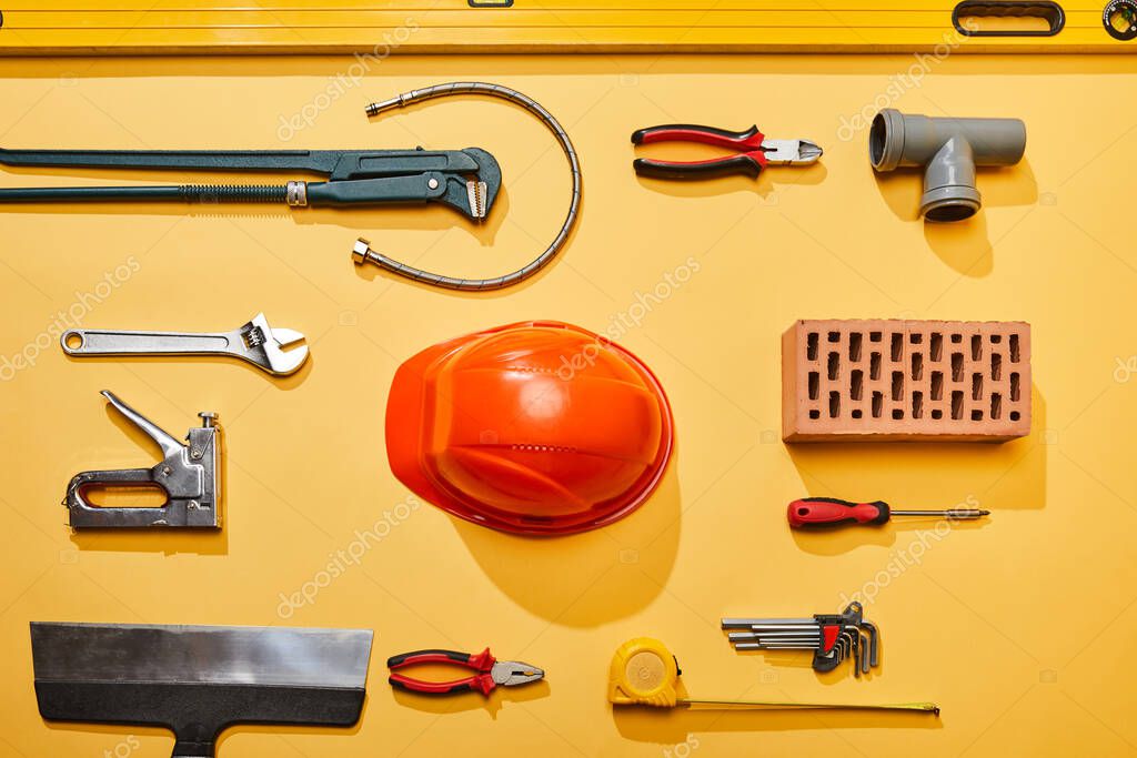 вид на промышленные инструменты, шлем, сантехнический шланг и кирпич на желтом фоне