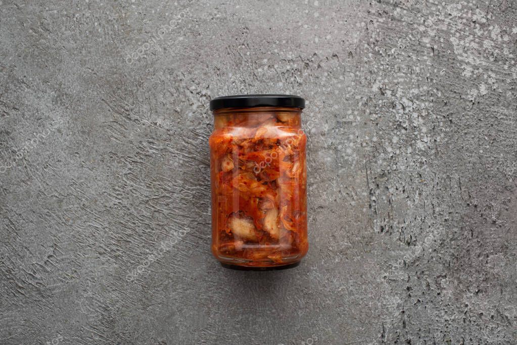 вид сверху на кимчи в банке на сером бетонном фоне