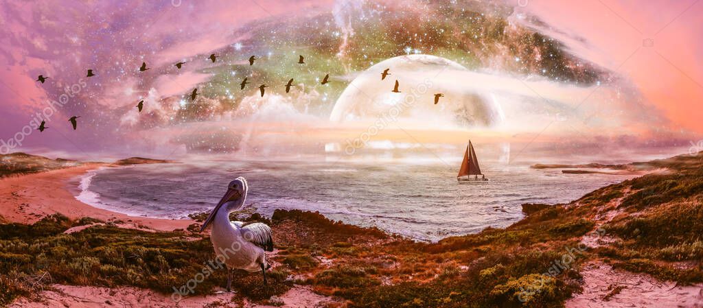 - Парусник в океане с пеликаном на берегу и чужая планета на горизонте на закате - фантазийный пейзаж. Элементы этого изображения предоставлены НАСА