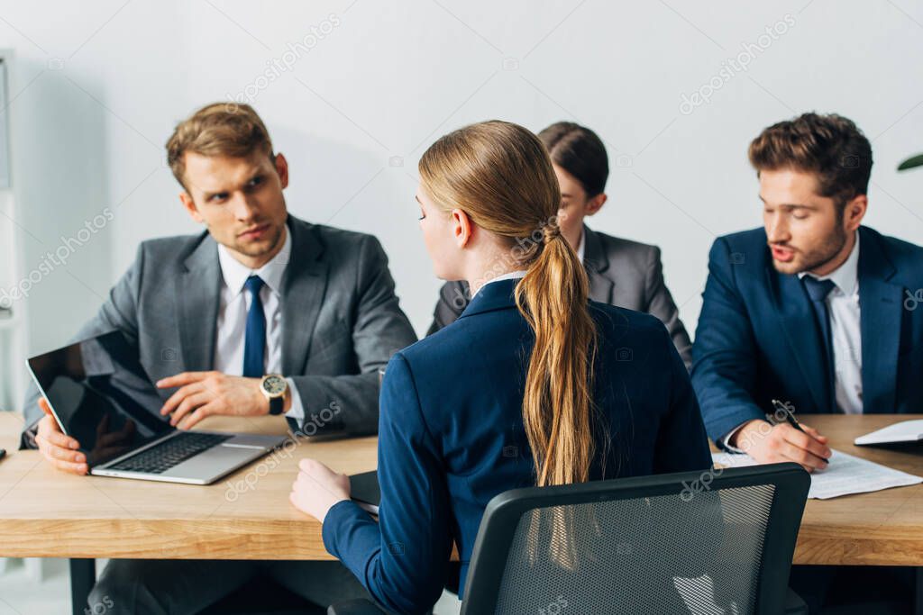 Выборочный фокус сотрудника, смотрящего на ноутбук во время собеседования с вербовщиками в офисе